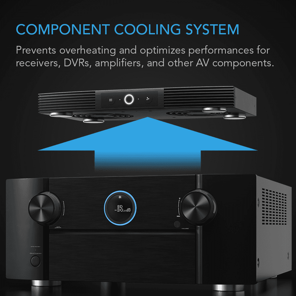 A quiet cooling fan system designed to be placed on top of AV components such as receivers, routers, game consoles, and AV cabinet components. Maintaining an optimal temperature for components prevents overheating, ensures constant performance, and extends their lifespan. The controller on the front of the cooling system features a smart thermostat trigger and fan speed control. The steel enclosure houses three dual-ball bearing blowers that pull heat out of the component and exhausts out the rear. The dual ball bearings also allow this fan system to be mounted horizontally or vertically. Its low-profile design enables the unit to fit in tight spaces. Includes corded power adapter to plug the fan system through an outlet.
